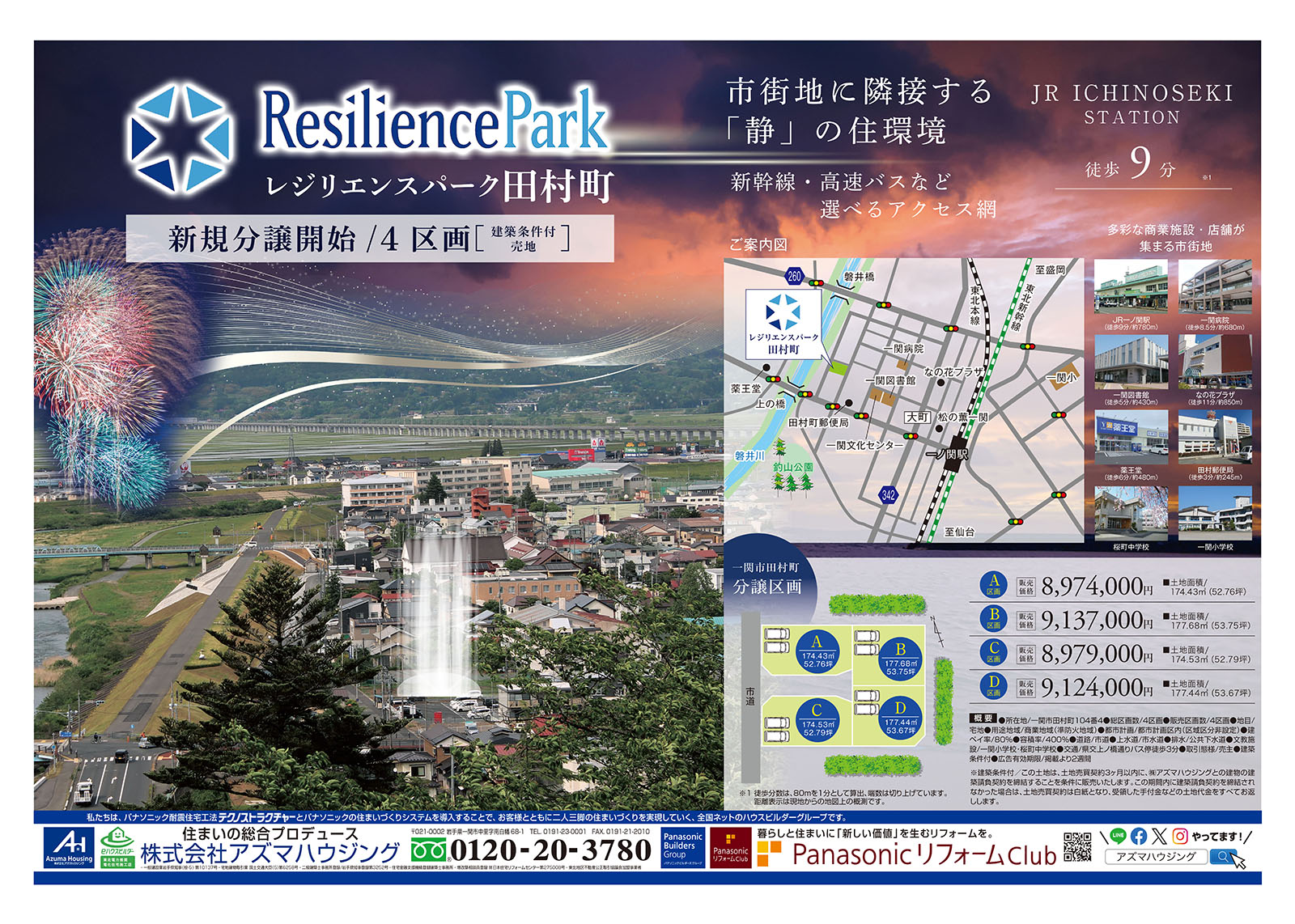 【新規分譲開始】レジリエンスパーク田村町 市街地に隣接する「静」の住環境の好立地に全4区画で販売開始します。 一関駅まで徒歩9分で新幹線・高速バスなどにアクセス抜群です。 現地のご案内は随時承ります。 お問合せをお待ちしております。
