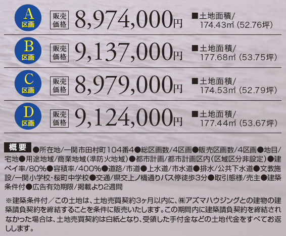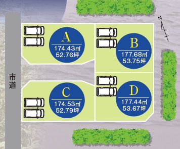 - 宅地面積174.53㎡(52.79坪)~177.68㎡(53.75坪)